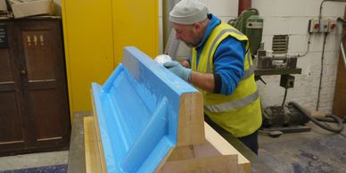 A pattern is, basically, an exact model of what is to be cast. They are traditionally made of wood, but can also be made of resins, fibreglass, plastics and even polystyrene. Once complete, a sand mould is formed around the pattern, so that when the pattern is removed, it leaves a cavity into which molten iron is poured. This then forms the casting.